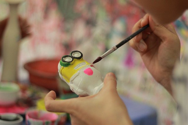Các em nhỏ hào hứng vẽ hoa văn lên các sản phẩm gốm, sứ.
