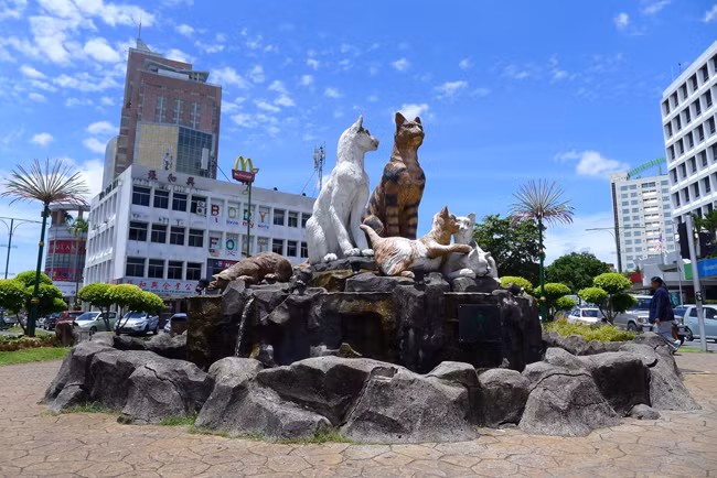 Những người yêu mèo nhất định sẽ cảm thấy vừa lòng khi thăm quan thành phố xinh đẹp đầy nắng, gió,... và mèo này. Chỉ cần đi từ sân bay quốc tế Kuching đến khu nội thành, du khách có thể nhìn thấy hình bóng của những người bạn bốn chân dễ thương ở khắp mọi nơi. Một chú mèo trắng khổng lồ giơ bàn chân hồng hồng vẫy chào các vị khách ghé thăm khu phố người Hoa. Chú còn thay đổi trang phục theo từng ngày lễ trong năm nữa.