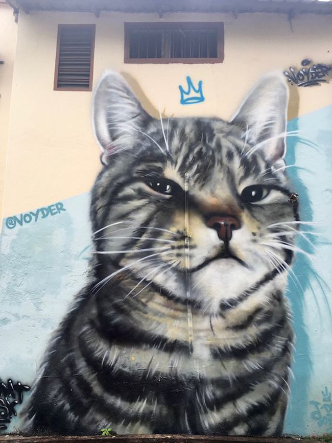 Những chú mèo bằng sơn xịt lên tường ẩn mình trong những con ngõ nhỏ xung quanh các tòa nhà như một hình thức nghệ thuật đường phố độc đáo và dễ thương.