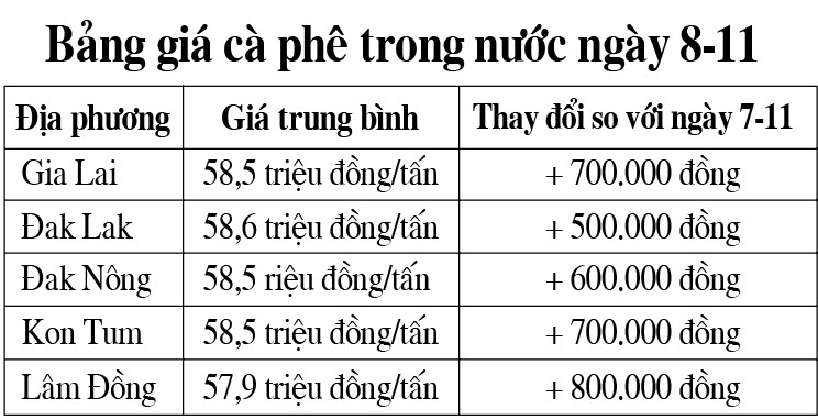 Trong khi đó, với mức điều chỉnh tăng 800.000 đồng/tấn, giá cà phê tại Lâm Đồng hiện ở mức 57,9 triệu đồng/tấn.