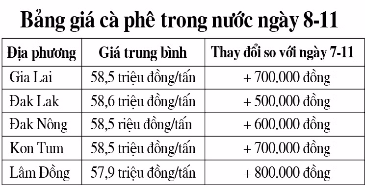 Cụ thể, sau khi tăng 700.000 đồng/tấn, giá cà phê tại tỉnh Gia Lai và Kon Tum cùng ở mức 58,5 triệu đồng/tấn.