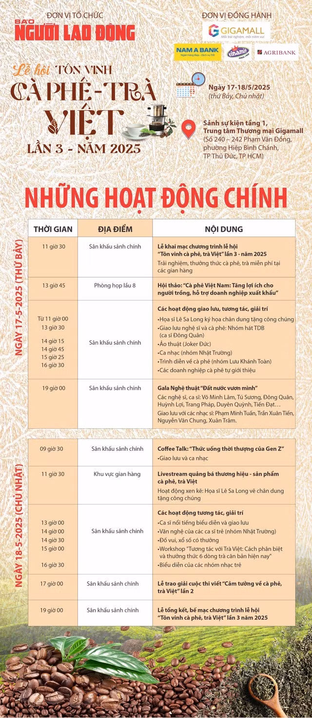 Cuối tuần này, từ 9 giờ ngày 17-5 đến 21 giờ ngày 18-5, tại Trung tâm thương mại Gigamall Thủ Đức (TP Thủ Đức, TP HCM), Báo Người Lao Động tổ chức Chương trình "Tôn vinh Cà phê – Trà Việt" lần 3 - 2025 với nhiều hoạt động hấp dẫn.