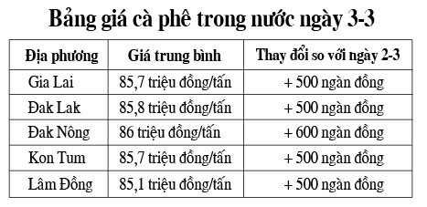 Cụ thể, sau khi điều chỉnh tăng 500 ngàn đồng/tấn, giá cà phê tại tỉnh Gia Lai và Kon Tum cùng ở mức 85,7 triệu đồng/tấn.