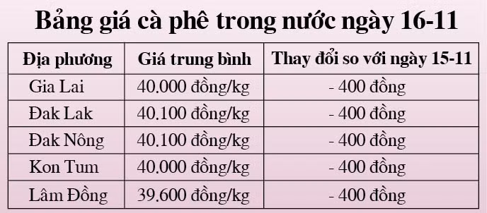(GLO)- Theo thông tin từ Báo Công thương, trang thông tin điện tử tổng hợp vietnambiz.vn, website giacaphe.com, giá cà phê trong nước ngày 16-11 giảm 400 đồng/kg, dao động từ 39.600 đồng đến 40.100 đồng/kg.