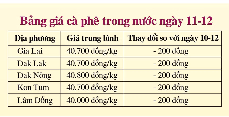 (GLO)- Theo thông tin từ Báo Công thương, trang thông tin điện tử tổng hợp vietnambiz.vn, website giacaphe.com, giá cà phê trong nước ngày 11-12 giảm 200 đồng/kg, dao động từ 40.000 đồng đến 40.800 đồng/kg.