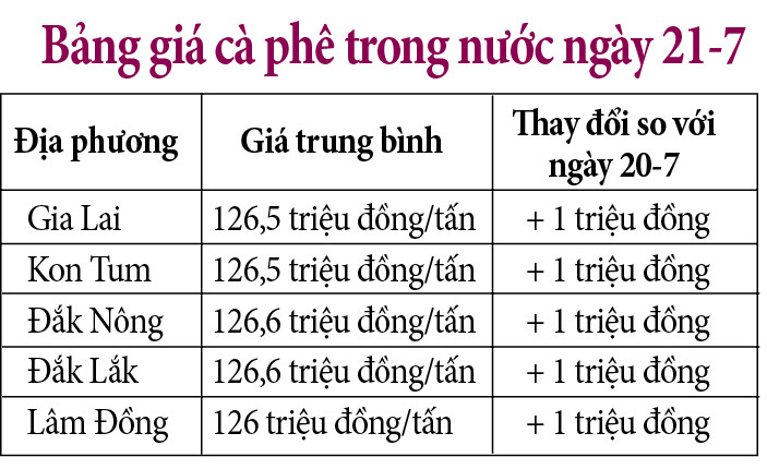 Cụ thể, sau khi tăng, giá cà phê tại tỉnh Gia Lai và Kon Tum cùng ở mức 126,5 triệu đồng/tấn.