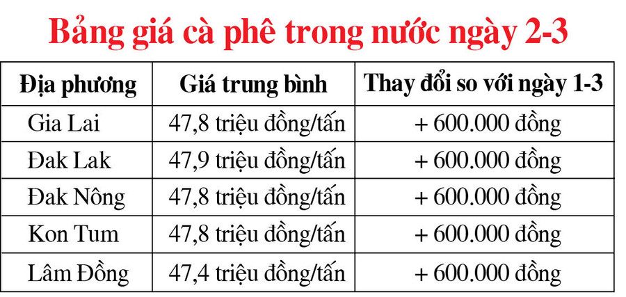 Cụ thể, sau khi điều chỉnh, giá cà phê tại tỉnh Gia Lai, Kon Tum và Đak Nông cùng ở ở mức 47,8 triệu đồng/tấn.