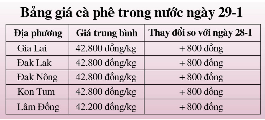 Đối với thị trường thế giới, giá cà phê ngày 29-1 ghi nhận tăng liên tiếp lần thứ 5 và thứ 7 lần lượt ở 2 sàn London và New York.