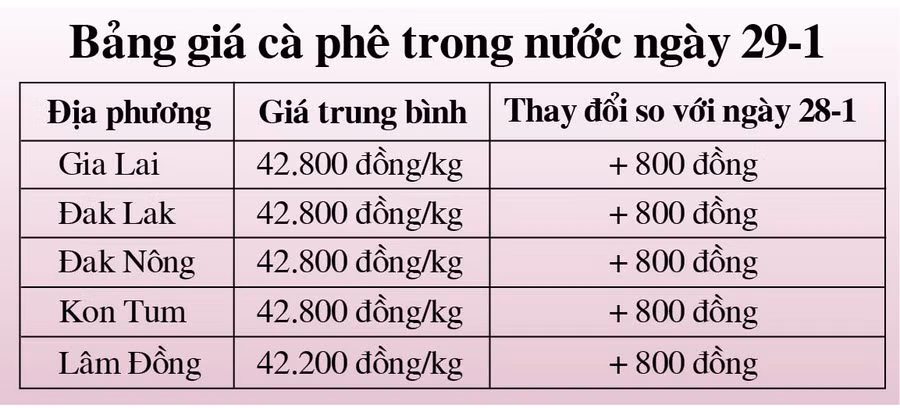 Cụ thể, sau khi điều chỉnh, giá cà phê tại các tỉnh Gia Lai, Kon Tum, Đak Lak và Đak Nông cùng ở mức 42.800 đồng/kg.