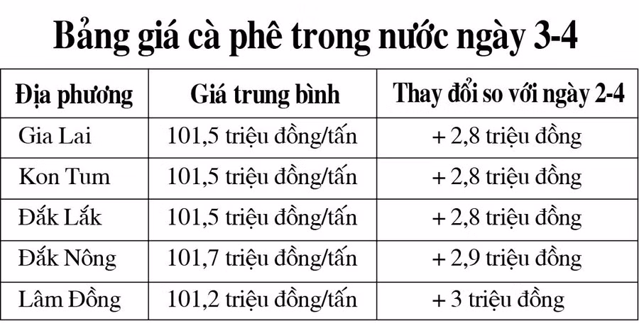 Cụ thể, sau khi điều chỉnh tăng 2,8 triệu đồng/tấn, giá cà phê tại các tỉnh Gia Lai, Kon Tum và Đắk Lắk cùng ở mức 101,5 triệu đồng/tấn.