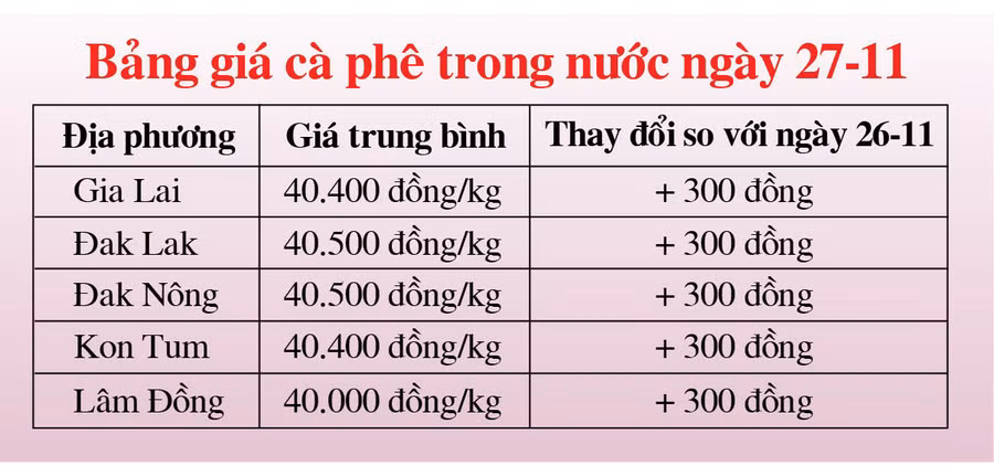 (GLO)- Theo thông tin từ Báo Công thương, trang thông tin điện tử tổng hợp vietnambiz.vn, website giacaphe.com, giá cà phê trong nước ngày 27-11 tăng 300 đồng/kg, dao động từ 40.000 đồng đến 40.500 đồng/kg.