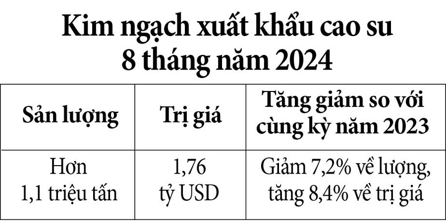 Tính chung 8 tháng năm 2024, Việt Nam đã xuất khẩu hơn 1,1 triệu tấn cao su, trị giá 1,76 tỷ USD (giảm 7,2% về lượng nhưng tăng 8,4% về trị giá so với cùng kỳ năm 2023). Giá xuất khẩu cao su trung bình trong tháng 8-2024 đạt 1.637 USD/tấn (tăng 26,8% so với cùng kỳ năm 2023).