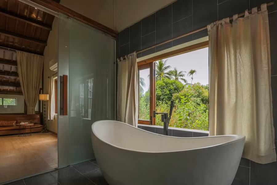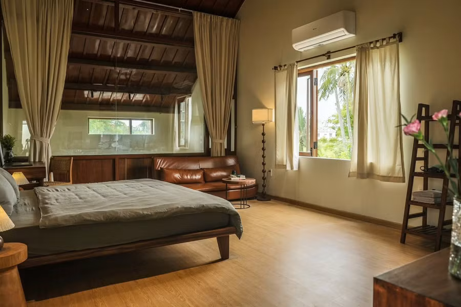 Phòng ngủ được đặt trên tầng 2 cùng với phòng tắm có bồn cho thời gian riêng tư. Không gian tràn ngập ánh sáng và thoáng đãng nhờ phần mái cao.
