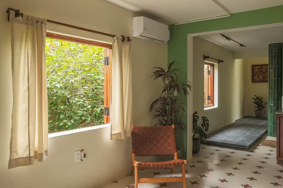 Bên trong, không gian mở được sử dụng cho phòng khách, bếp và bàn ăn lớn. Sàn được thay gạch lát. Hai bên mở thêm cửa sổ để lấy ánh sáng tự nhiên vào nhà. Phòng khách và khu vực bàn ăn bởi khung vòm cong mềm mại.