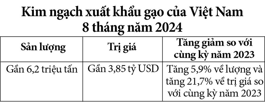 Giá xuất khẩu gạo trung bình của Việt Nam trong 8 tháng qua đạt 542 USD/tấn (tăng 11,5% so với cùng kỳ năm 2023).