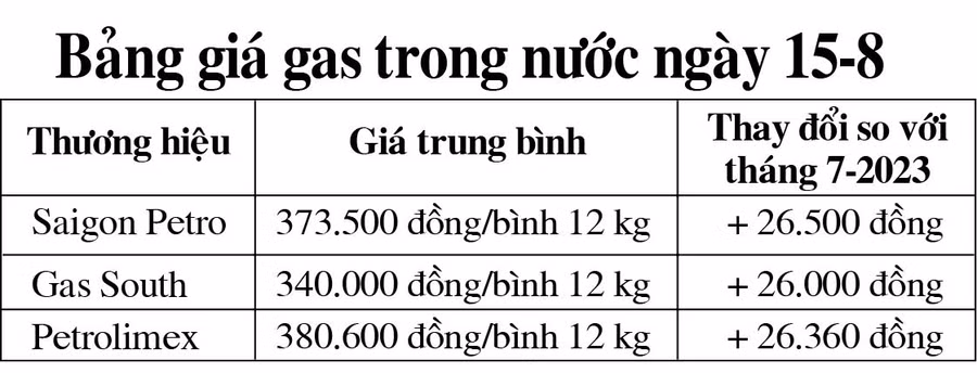 Trong khi đó, Báo Thanh Niên cho biết, từ đầu tháng 8-2023 tại thị trường trong nước, nhiều doanh nghiệp kinh doanh gas đã thông báo điều chỉnh tăng giá mặt hàng này từ 26.000 đến 26.500 đồng/bình 12 kg, tùy thương hiệu.