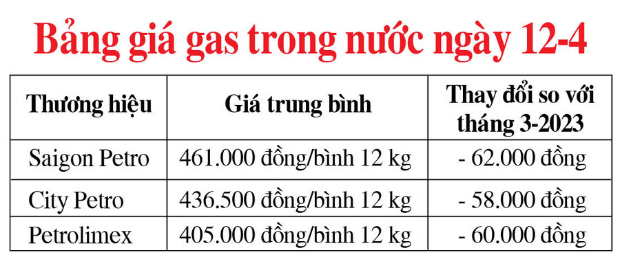 Trong khi đó, từ đầu tháng 4-2023 tại thị trường trong nước, nhiều doanh nghiệp kinh doanh gas đã thông báo điều chỉnh giảm giá. Theo đó, mỗi bình gas loại 12 kg đến tay người tiêu dùng giảm trung bình từ 58.000 đồng đến 62.000 đồng.