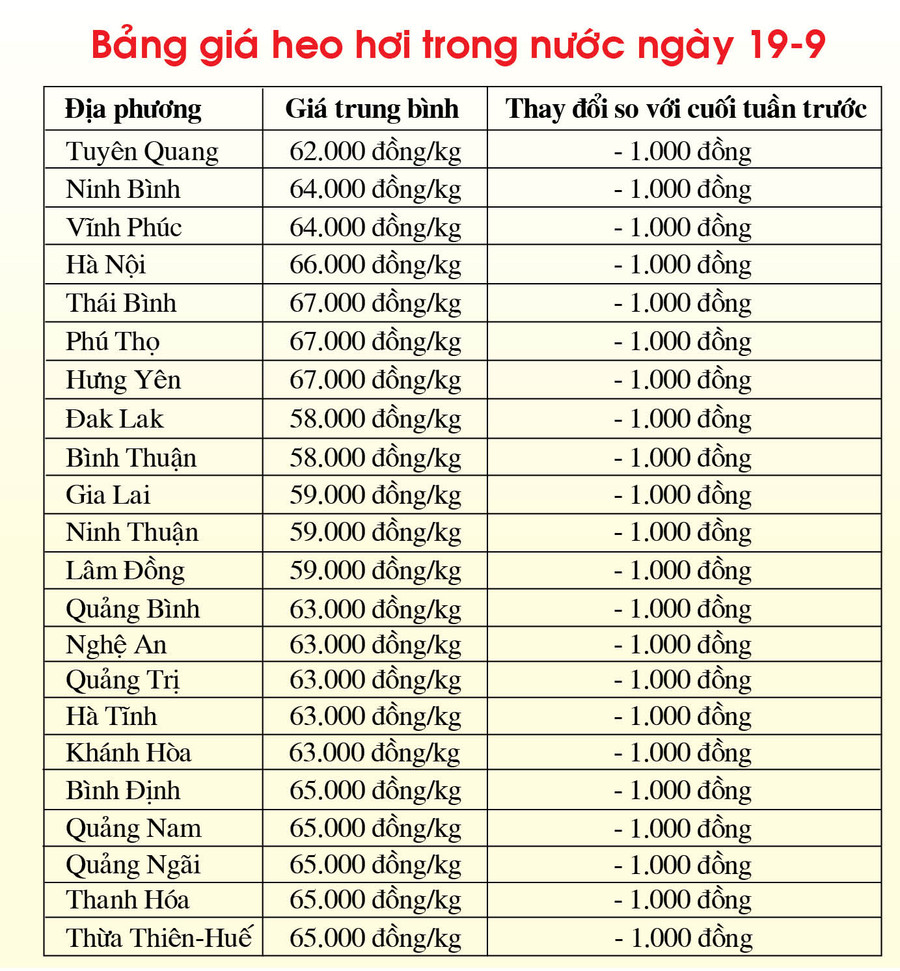 Tương tự, mức giá được ghi nhận tại tỉnh Khánh Hòa sau khi giảm 1.000 đồng/kg là 63.000 đồng/kg, ngang bằng với Nghệ An, Hà Tĩnh, Quảng Bình, Quảng Trị. Đak Lak, Bình Thuận hiện vẫn là các địa phương có mức heo hơi thấp nhất khu vực 58.000 đồng/kg. Mức giá cao nhất khu vực 65.000 đồng/kg được ghi nhận tại các tỉnh: Thanh Hóa, Thừa-Thiên Huế, Quảng Nam, Quảng Ngãi, Bình Định.