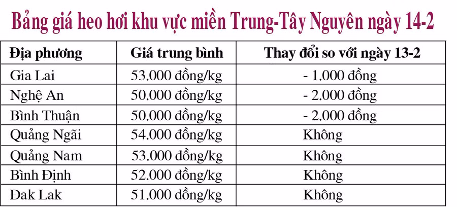 Trong khi đó, giá heo hơi ở các địa phương còn lại trong khu vực không có biến động. Mức giá cao nhất được ghi nhận tại Quảng Ngãi với 54.000 đồng/kg.