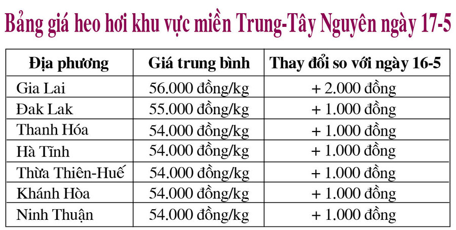 Tương tự, giá heo hơi tại các tỉnh Khánh Hòa, Ninh Thuận, Thanh Hóa, Hà Tĩnh, Thừa Thiên-Huế sau khi điều chỉnh tăng 1.000 đồng/kg, cùng ở mức 54.000 đồng/kg.