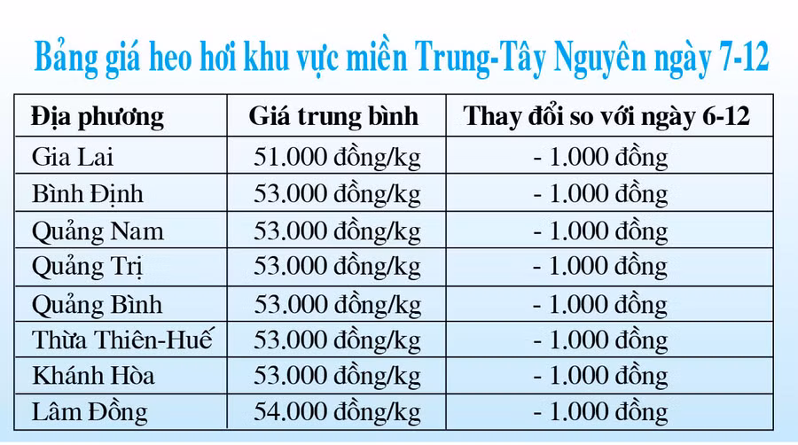 Các tỉnh: Bình Định, Quảng Nam, Quảng Trị, Quảng Bình, Thừa Thiên-Huế và Khánh Hòa, sau khi giảm 1.000 đồng/kg, giá heo hơi cùng ở mức 53.000 đồng/kg.