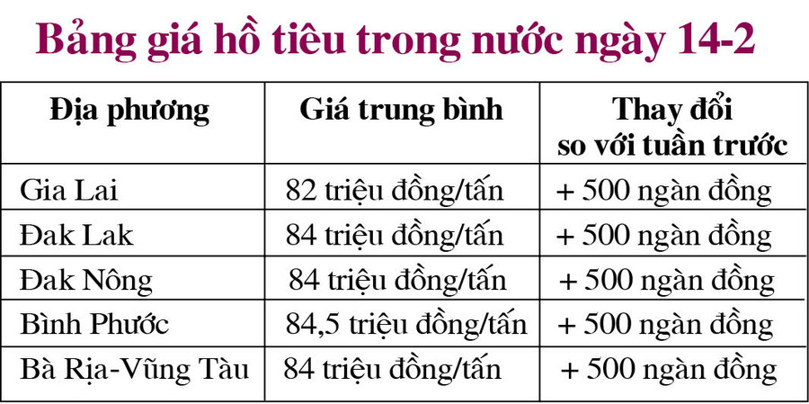 Trong khi đó, hồ tiêu tại Bà Rịa-Vũng Tàu và Bình Phước được thu mua lần lượt với giá 84 triệu đồng/tấn và 84,5 triệu đồng/tấn.