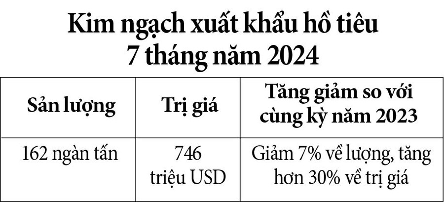 Trong 7 tháng năm 2024, xuất khẩu hồ tiêu của Việt Nam đạt khoảng 162 ngàn tấn, trị giá 746 triệu USD (giảm 7% về lượng, nhưng tăng hơn 30% về trị giá). Giá tiêu xuất khẩu bình quân 7 tháng năm 2024 đạt 4.604 USD/tấn (tăng 23% so với cùng kỳ năm trước).