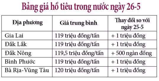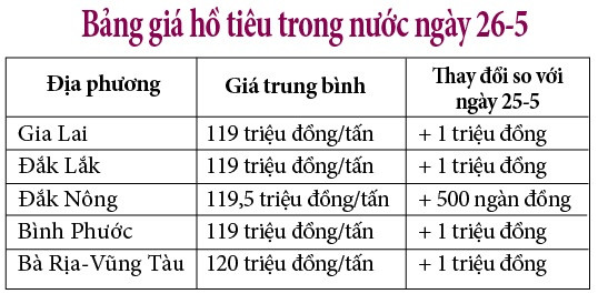 Cụ thể, sau khi điều chỉnh tăng 1 triệu đồng/tấn, giá hồ tiêu tại các tỉnh Gia Lai, Đắk Lắk, Bình Phước cùng ở mức 119 triệu đồng/tấn.