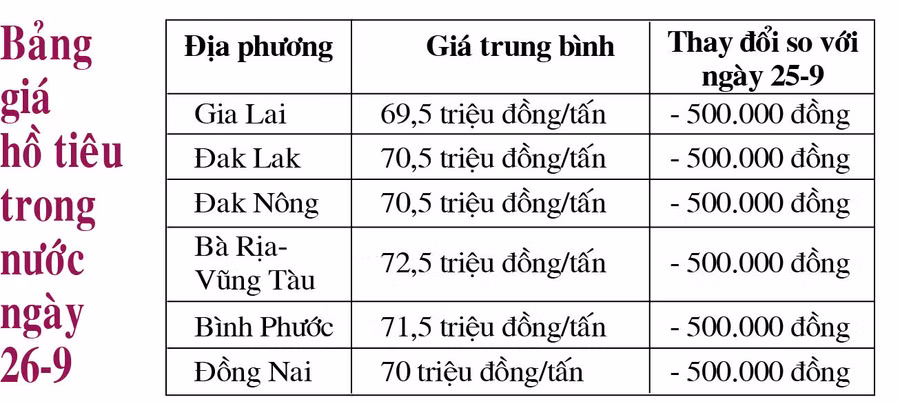 Trong khi đó, hồ tiêu tại tỉnh Bình Phước và Đồng Nai lần lượt có giá 71,5 triệu đồng/tấn và 70 triệu đồng/tấn.