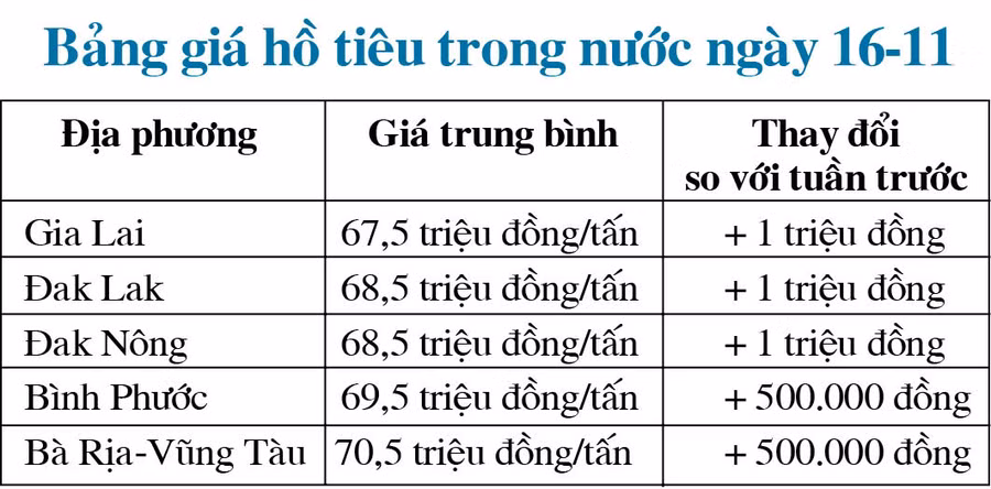 Trong khi đó, với mức tăng 500.000 đồng/tấn, hồ tiêu tại tỉnh Bình Phước và Bà Rịa-Vũng Tàu lần lượt có giá 69,5 triệu đồng/tấn và 70,5 triệu đồng/tấn.