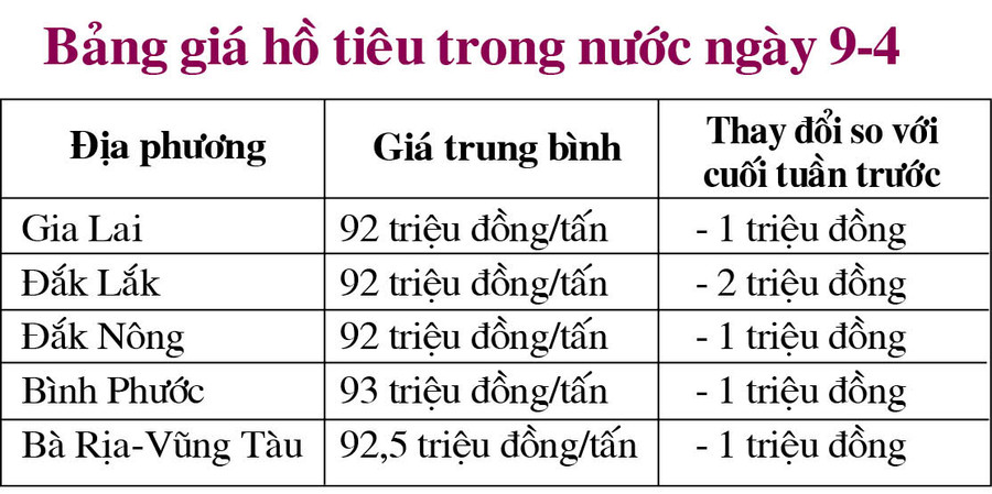 Với mức giảm tương tự, hồ tiêu tại Bình Phước và Bà Rịa-Vũng Tàu đang được thu mua với giá lần lượt là 93 triệu đồng/tấn và 92,5 triệu đồng/tấn.