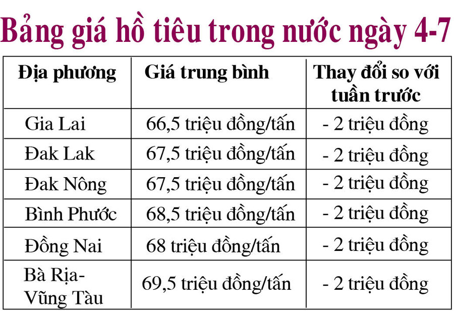 Trong khi đó, hồ tiêu tại tỉnh Đồng Nai và Bình Phước lần lượt có giá 68 triệu đồng/tấn và 68,5 triệu đồng/tấn.