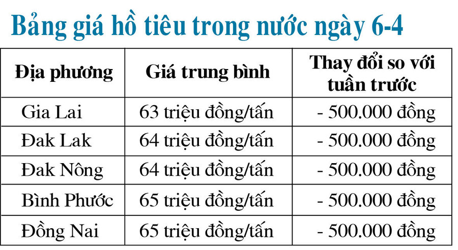 Trên thị trường thế giới, giá hồ tiêu đen của Việt Nam ngày 6-4 đang được Cộng đồng Hồ tiêu thế giới (IPC) niêm yết ở mức 3.275 USD/tấn; hồ tiêu trắng ở mức 4.780 USD/tấn.