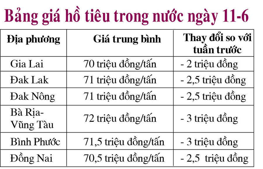 Trong khi đó, với mức giảm 3 triệu đồng/tấn, hồ tiêu tại tỉnh Bình Phước và Bà Rịa-Vũng Tàu lần lượt có giá 71,5 triệu đồng/tấn và 72 triệu đồng/tấn.