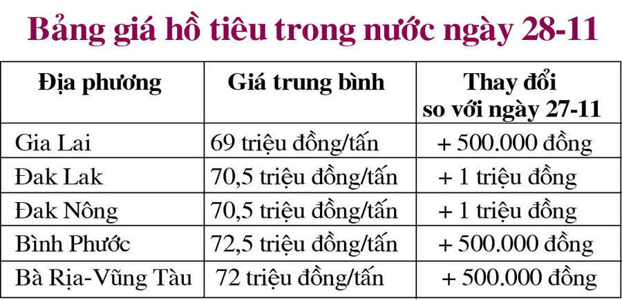 Trong khi đó, hồ tiêu tại tỉnh Bà Rịa-Vũng Tàu và Bình Phước lần lượt có giá 72 triệu đồng/tấn và 72,5 triệu đồng/tấn (cùng tăng 500.000 đồng/tấn).
