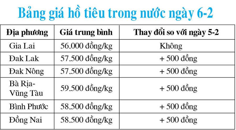 Cụ thể, tại tỉnh Bình Phước và Đồng Nai, hồ tiêu có giá 58.500 đồng/kg.