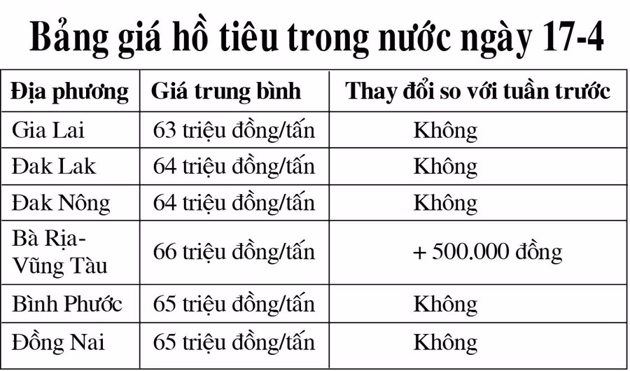 Tại khu vực Đông Nam Bộ, ngoại trừ Bà Rịa-Vũng Tàu, các địa phương còn lại không ghi nhận biến động về giá. Theo đó, tại tỉnh Bình Phước và Đồng Nai, hồ tiêu có giá 65 triệu đồng/tấn. Bà Rịa-Vũng Tàu sau khi điều chỉnh là tỉnh có mức giá thu mua hồ tiêu cao nhất cả nước với 66 triệu đồng/tấn.