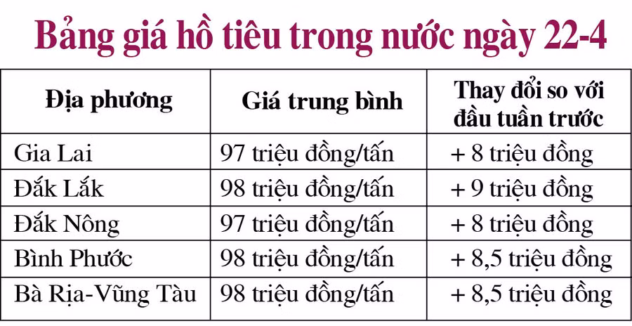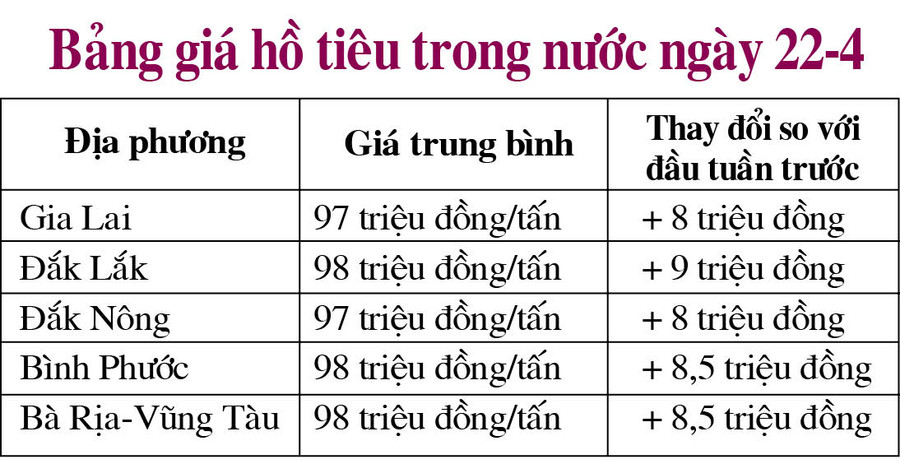 Cụ thể, sau khi tăng 8 triệu đồng/tấn, hồ tiêu tại Gia Lai và Đắk Nông được thu mua ở mức 97 triệu đồng/tấn.
