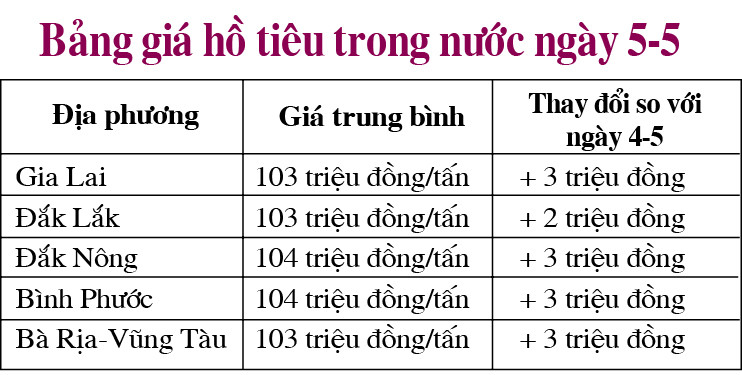 Cụ thể, hồ tiêu tại Gia Lai và Đắk Lắk đang được thu mua ở mức 103 triệu đồng/tấn sau khi tăng lần lượt 3 triệu đồng/tấn và 2 triệu đồng/tấn.