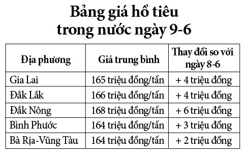 Trong khi đó, hồ tiêu tại Bà Rịa-Vũng Tàu và Bình Phước cùng có giá 164 triệu đồng/tấn sau khi tăng lần lượt 2 triệu đồng/tấn và 3 triệu đồng/tấn.