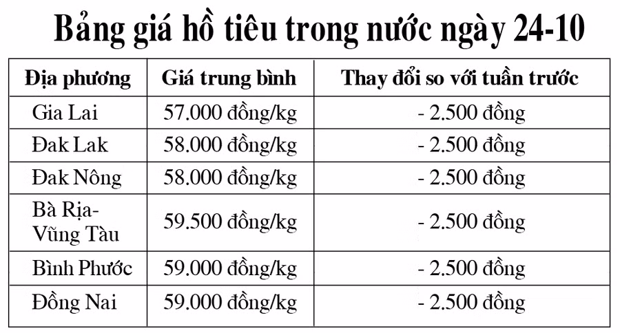 (GLO)- Theo nguồn tin từ Báo Công thương, trang thông tin điện tử tổng hợp vietnambiz.vn, website giatieu.com, giá hồ tiêu trong nước ngày 24-10 tiếp tục giảm 2.500 đồng/kg so với tuần trước tại các vùng trồng trọng điểm trên cả nước.
