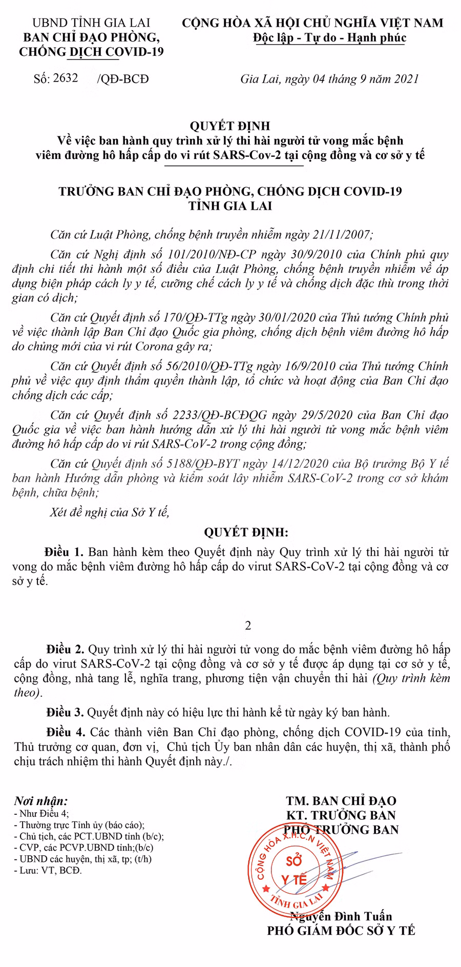 (GLO)- Ngày 4-9, Ban Chỉ đạo phòng-chống dịch Covid-19 tỉnh Gia Lai có Quyết định số 2632/QĐ-BCĐ về việc ban hành quy trình xử lý thi hài người tử vong mắc bệnh viêm đường hô hấp cấp do vi rút SARS-CoV-2 tại cộng đồng và cơ sở y tế.