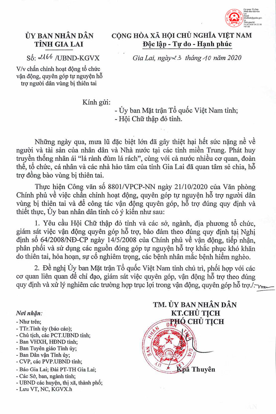 (GLO)- Ngày 23-10, UBND tỉnh Gia Lai có Công văn số 2166/UBND-KGVX về việc chấn chỉnh hoạt động tổ chức vận động, quyên góp tự nguyện hỗ trợ người dân vùng bị thiên tai.