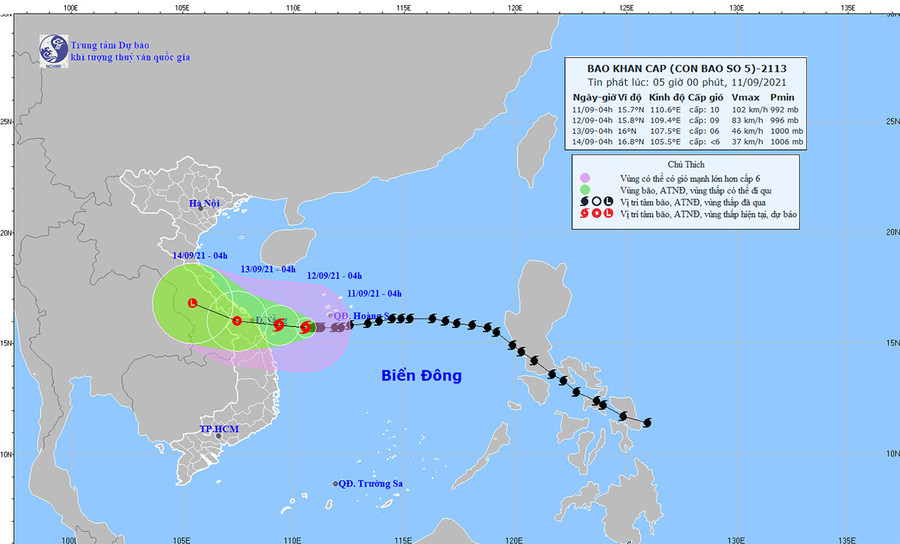 (GLO)- Hồi 4 giờ ngày 11-9, vị trí tâm bão ở khoảng 15,7 độ Vĩ Bắc; 110,6 độ Kinh Đông, cách bờ biển Quảng Trị-Quảng Nam khoảng 230 km về phía Đông. Sức gió mạnh nhất vùng gần tâm bão mạnh cấp 10 (90-100 km/giờ), giật cấp 12. Bán kính gió mạnh từ cấp 6, giật từ cấp 8 trở lên khoảng 170 km tính từ tâm bão.
