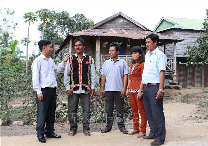 Đảng ủy xã Chư Mố (huyện Ia Pa), chi bộ thôn Ơi H’Trông đến tuyên truyền chính sách của Đảng đến với gia đình quần chúng ưu tú Ksor Luy (thứ hai từ trái sang) tại thôn Ơi H’Trông. Ảnh: Hồng Điệp