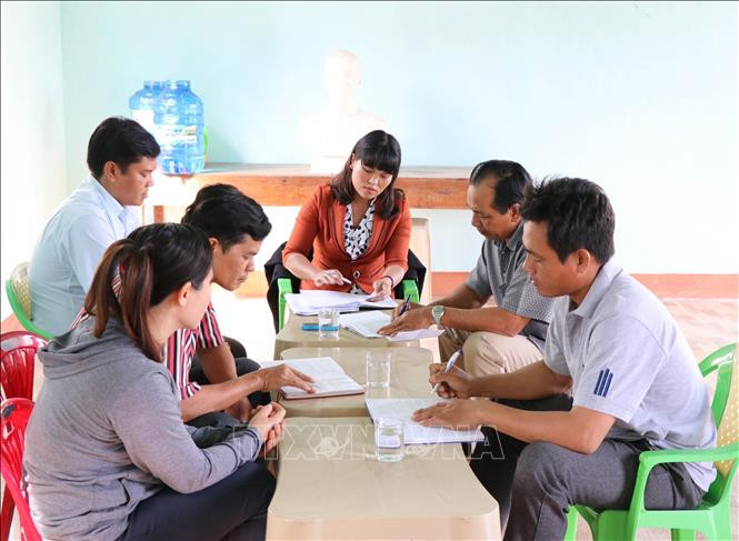 Chị Siu H’Đa (ngồi giữa, áo cam), Bí thư chi bộ thôn Ơi H’Trông, xã Chư Mố thường xuyên tổ chức các cuộc họp triển khai các chủ trương mới của Đảng đến đảng viên trong chi bộ. Ảnh: Hồng Điệp