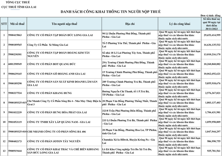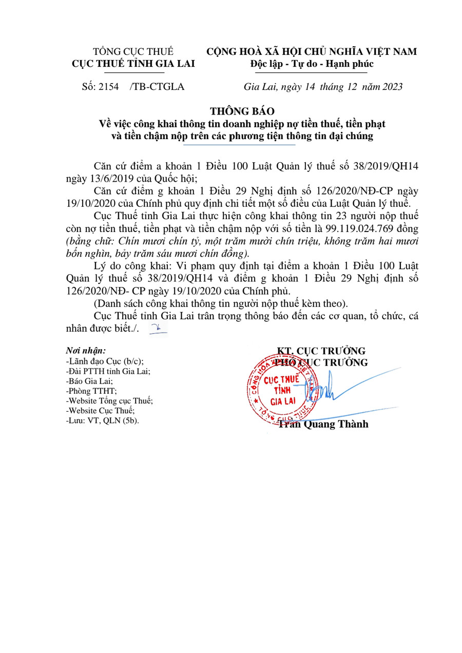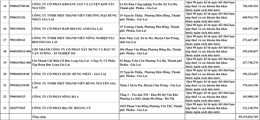 (GLO)- Cục Thuế tỉnh Gia Lai có Thông báo số 2154/TB-CTGLA về việc công khai thông tin 23 doanh nghiệp nợ tiền thuế, tiền phạt và tiền chậm nộp trên 99,1 tỷ đồng.
