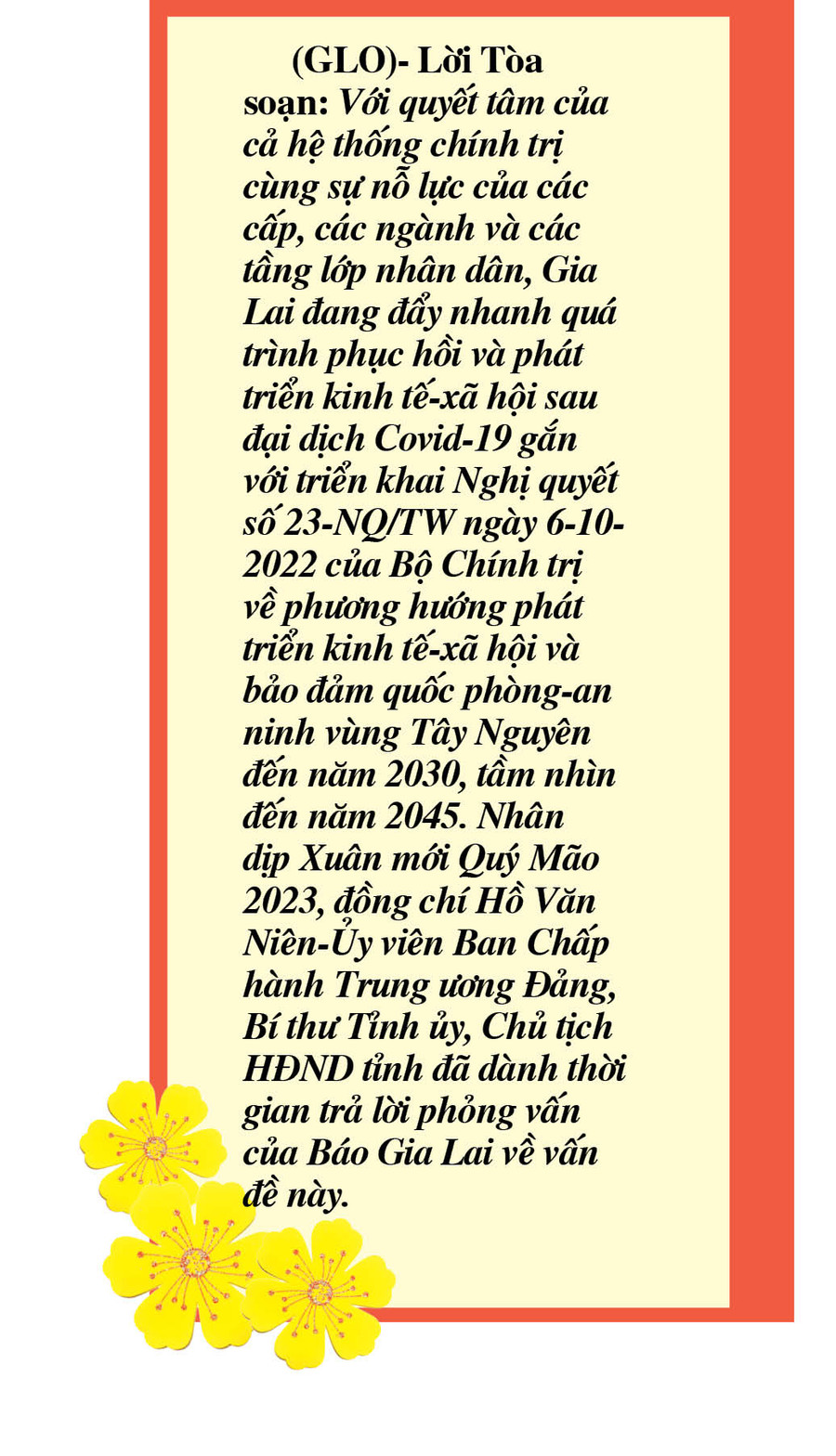 - Bí thư Tỉnh ủy HỒ VĂN NIÊN: Trước hết, Tỉnh ủy Gia Lai đồng thuận, nhất trí rất cao với nội dung Nghị quyết số 23-NQ/TW ngày 6-10-2022 của Bộ Chính trị về phương hướng phát triển kinh tế-xã hội và bảo đảm quốc phòng-an ninh vùng Tây Nguyên đến năm 2030, tầm nhìn đến năm 2045 và Nghị quyết số 152/NQ-CP ngày 15-11-2022 của Chính phủ về Chương trình hành động thực hiện Nghị quyết số 23-NQ/TW. Với sự quan tâm đặc biệt và lãnh đạo quyết liệt của Bộ Chính trị, Ban Bí thư, Chính phủ cho sự phát triển của Tây Nguyên và các vùng trong cả nước, cùng sự hỗ trợ tích cực của các cơ quan Trung ương; sự cố gắng, nỗ lực của các địa phương trong vùng, Tỉnh ủy Gia Lai tin tưởng rằng, nghị quyết của Bộ Chính trị và Chính phủ sẽ nhanh chóng đi vào cuộc sống; các địa phương trong vùng sẽ sớm có điều kiện vươn lên, thu hẹp khoảng cách với các vùng miền khác của cả nước; đời sống vật chất và tinh thần của người dân, nhất là đồng bào dân tộc thiểu số sẽ được cải thiện và ngày càng nâng cao; quốc phòng-an ninh được đảm bảo vững chắc; tổ chức Đảng, hệ thống chính trị và khối đại đoàn kết ngày càng vững mạnh.