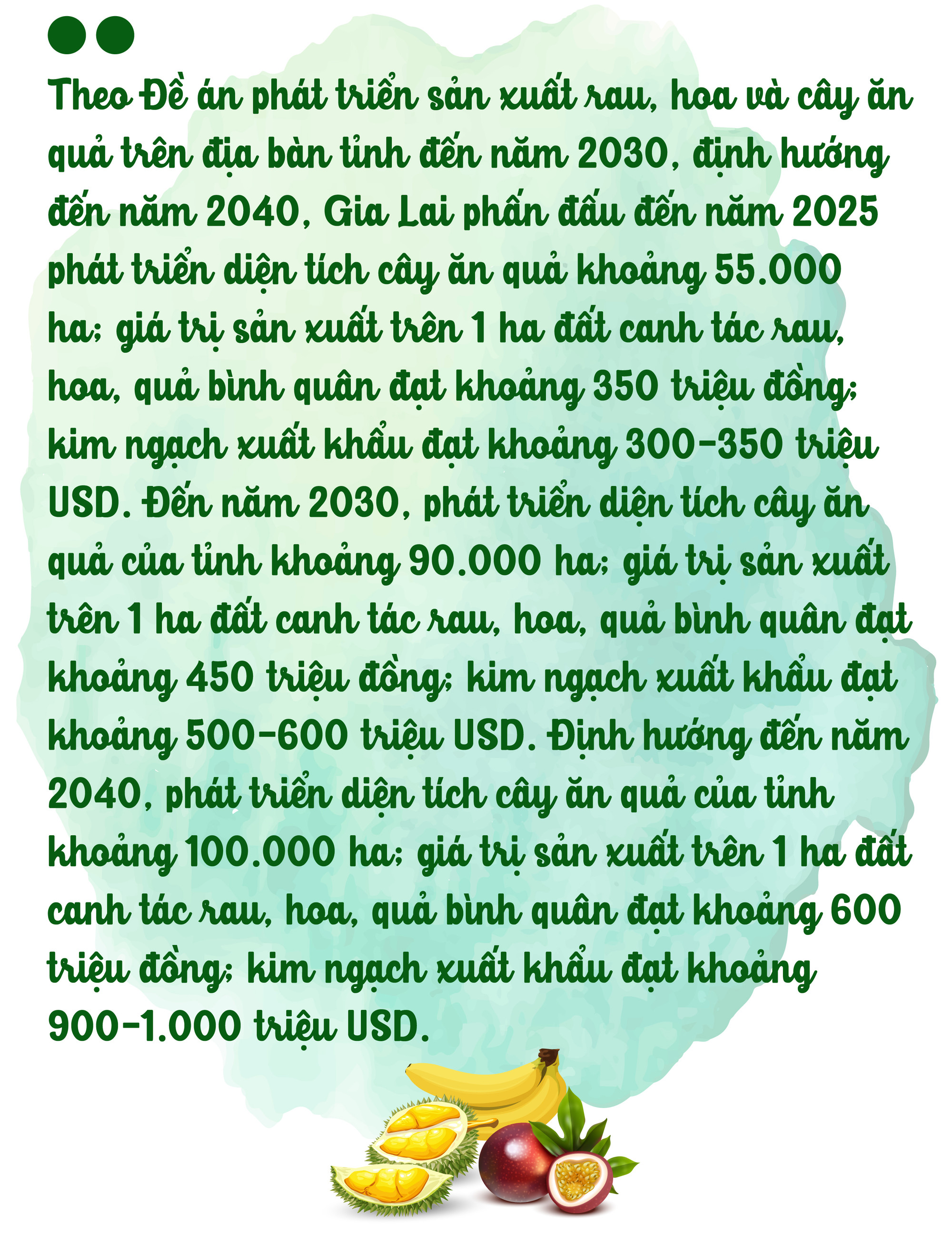 Gia Lai có điều kiện khí hậu, thổ nhưỡng khá thuận lợi để phát triển các loại cây ăn quả có giá trị kinh tế cao. Đến cuối năm 2023, toàn tỉnh có khoảng 32.000 ha cây ăn quả với sản lượng khoảng 560.000 tấn. Một số loại cây ăn quả chủ lực có giá trị kinh tế cao như chuối, sầu riêng, chanh dây đang phát triển mạnh về quy mô diện tích và đã hình thành các vùng sản xuất chuyên canh tập trung. Trên địa bàn tỉnh có khoảng 57 doanh nghiệp và 43 hợp tác xã đầu tư liên kết phát triển cây ăn quả với diện tích hơn 10.706 ha. Đến nay, toàn tỉnh đã được cấp 225 mã số vùng trồng với diện tích trên 9.634 ha và 35 mã số cơ sở đóng gói với công suất khoảng 1.445-1.595 tấn quả tươi/ngày, chủ yếu xuất khẩu sang Trung Quốc, Úc, Nhật Bản, New Zealand, Hoa Kỳ, Hàn Quốc…