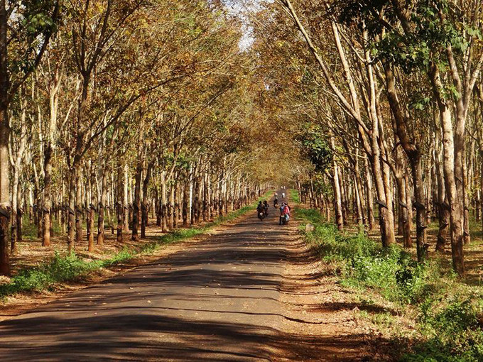 Ngoài mùa hoa cà phê, Tây Nguyên còn rất được du khách yêu thích khi bước vào mùa cao su thay lá. Gia Lai, nơi có diện tích rừng cao su lớn, là điểm đến lý tưởng thời gian này. Những cánh rừng đồng loạt chuyển màu lá sang vàng, đỏ như khung cảnh ở châu Âu. Đến khi cây trút hết lá, trơ cành khẳng khiu, khu rừng lại biến đổi với những khung hình lạ mắt mới. Du khách có thể tìm đến những cánh rừng cao su này ở huyện Chư Sê cách Pleiku 40 km về phía nam.